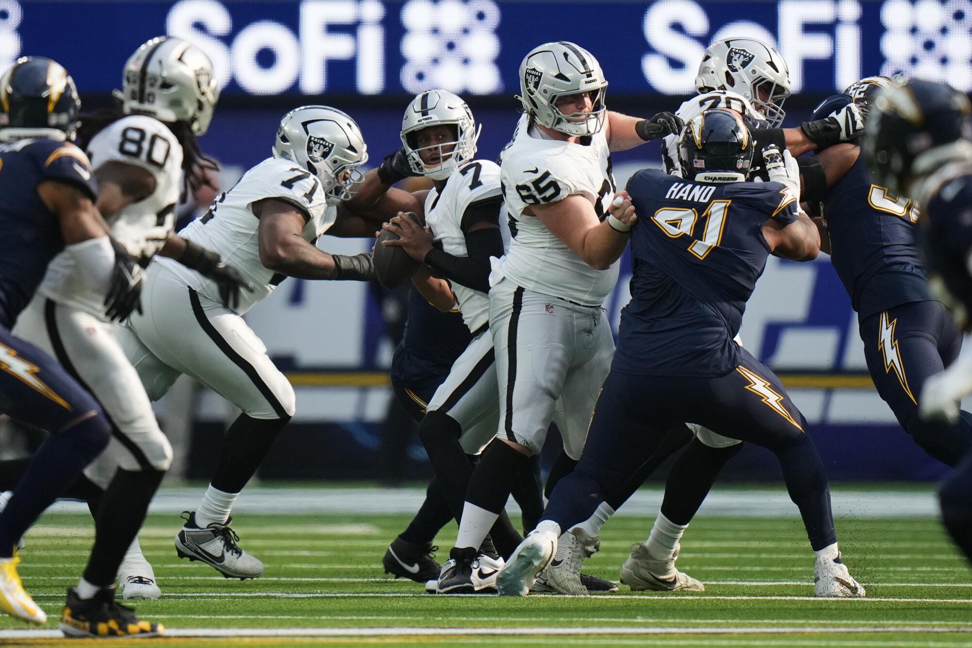 The Raiders did their job, wearing their classic away uniforms, which is almost always a perfect compliment to the rest of the AFC West… almost. It’s hard to make Sofi Stadium gloomy, but somehow this uniform matchup did just that.