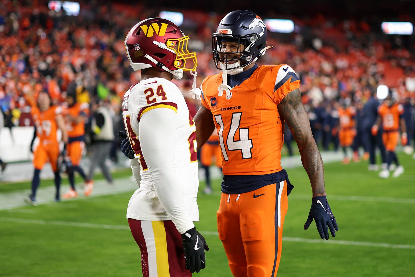 The Broncos orange jersey and pants isn’t a bad look of theirs, but against Washington, it was too much. Wearing all that orange against a blue, black, or purple team would be fine. There is too much red/orange/yellow hue in the Commanders burgundy and gold for the Broncos to break those out. Against an inferior uniform opponent, perhaps, but the Commanders uniforms demanded a bit more respect than the Broncos gave them.