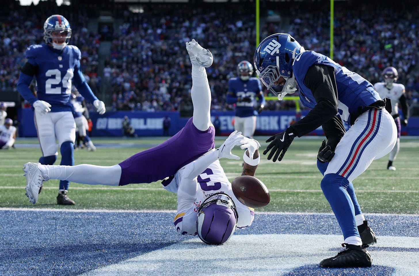 However, that being said, I loved it. The Vikings went with the checkerboard look, finally wearing white socks with purple pants. Great! New York’s home look is perfect, and complimented the Vikings’ white socks well.